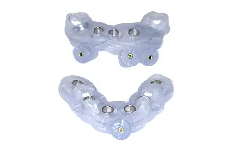 As the name suggests, a tissue supported surgical guide uses intraoral soft tissues for support and stability. This guide is commonly fabricated based on an existing removable prosthesis. Possible concerns with mucosa! support involve the lack of retention during surgery and variation in tissue thickness and quality -which is a common complaint also seen with complete dentures. A tissue supported guide has the potential to undergo movement in varying directions that could increase the inaccuracy of implant placement. This, along with flap reflection, may introduce additional complexity during implant placement. Tissue supported guides are designed from existing or new full dentures, and always require a dual scan. If the denture is not well-fitting, please perform a hard reline (not soft, and remove the soft if it exists and perform a hard reline). Scan the appliance in the mouth with the patient biting on the guide, not open separated. Scan the appliance again outside the mouth resting on foam or cotton rolls. This is the dual scan. Send us a bite and the opposing model.